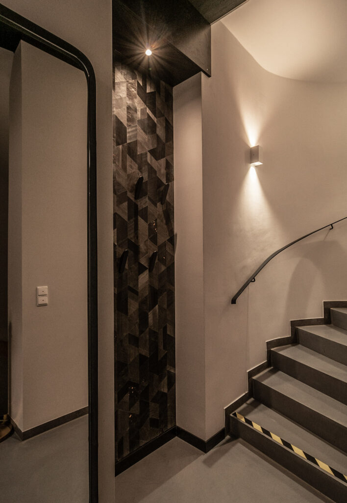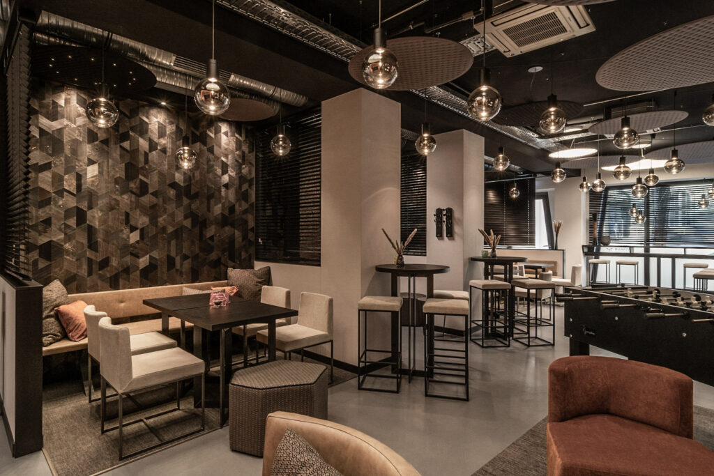 PLAN-B übernimmt Planung und Ausführung des Innenausbaus, d.h. die Umsetzung des Konzepts der Innenarchitekten für ein Mitarbeitercafé samt Aufenthaltsraum für den Kunden Merkur Bank im Herzen von München. Zum Konzept gehören neben der LED-Wand und der LED-Beleuchtung auch unterschiedliches Mobiliar in verschiedenen Zonen des Raums, z.B. für Pausen.