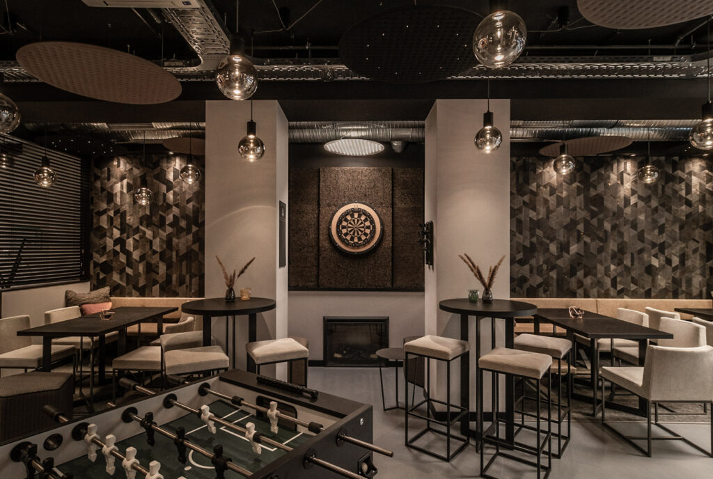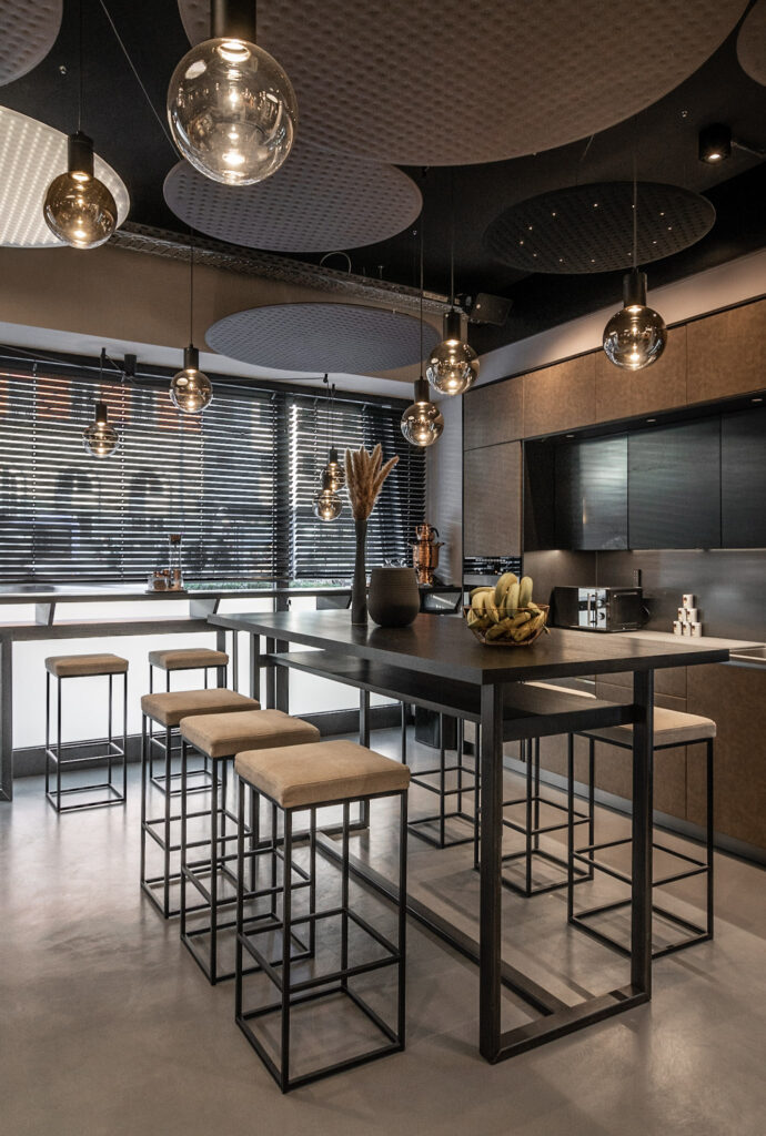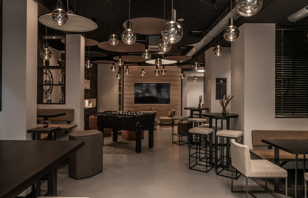 Leistungen: Innenausbau, Mitarbeitercafé, Aufenthaltsraum mit LED-Wand